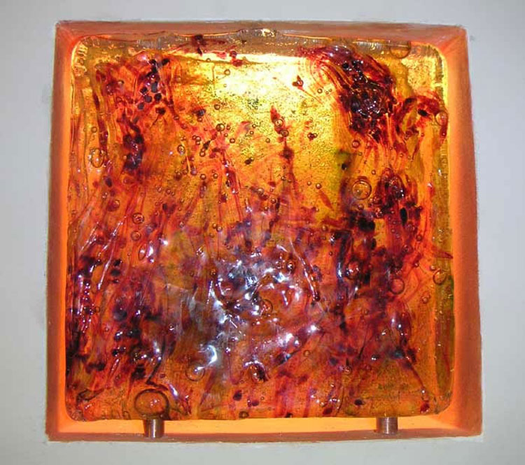 hinterleuchteter Glasquader, ca. 30x30 cm, Glassandguß mit farbigen Glasgranulateinschlüssen