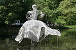 anmutende Figuren aus Drahtgewebe stehen am Ufer der Insel