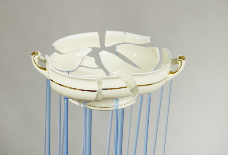 Schwebende Schale, Porzellan auf Acrylglasstäben, Höhe 60 cm, 2019 (Ausstellung "Who is afraid of Rosa", Leipzig 2019)